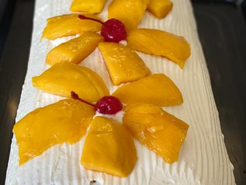 Esponjoso pan de vainilla, delicadamente humedecido con jarabe neutro, que realza su ternura sin opacar su sutil aroma. En su interior, una armoniosa mezcla de crema y trozos de mango aporta frescura y dulzura natural. Su cobertura de crema batida envuelve cada capa con ligereza, mientras que la decoración con láminas de mango y una cereza marrasquino añade un toque vibrante y sofisticado a este postre exquisito.